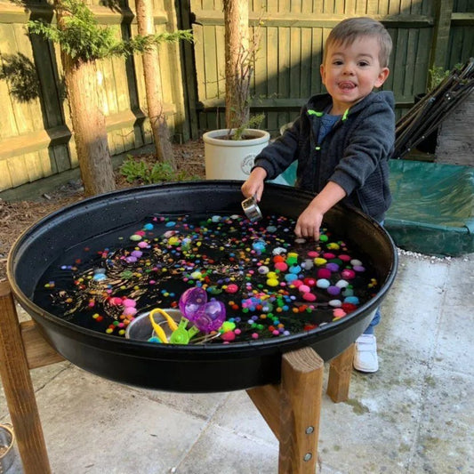 Tuff Tray Rond (69cm) Zwart + Onderstel + Wolvilt speelbakjes en ballen + Speelmat + houten pincetten 4st